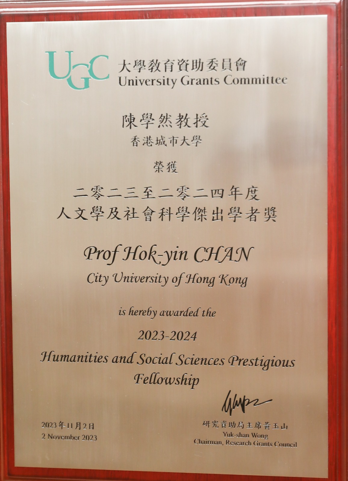 Professor Chan Hok Yin awarded UGC Humanities and Social Sciences Prestigious Fellowship