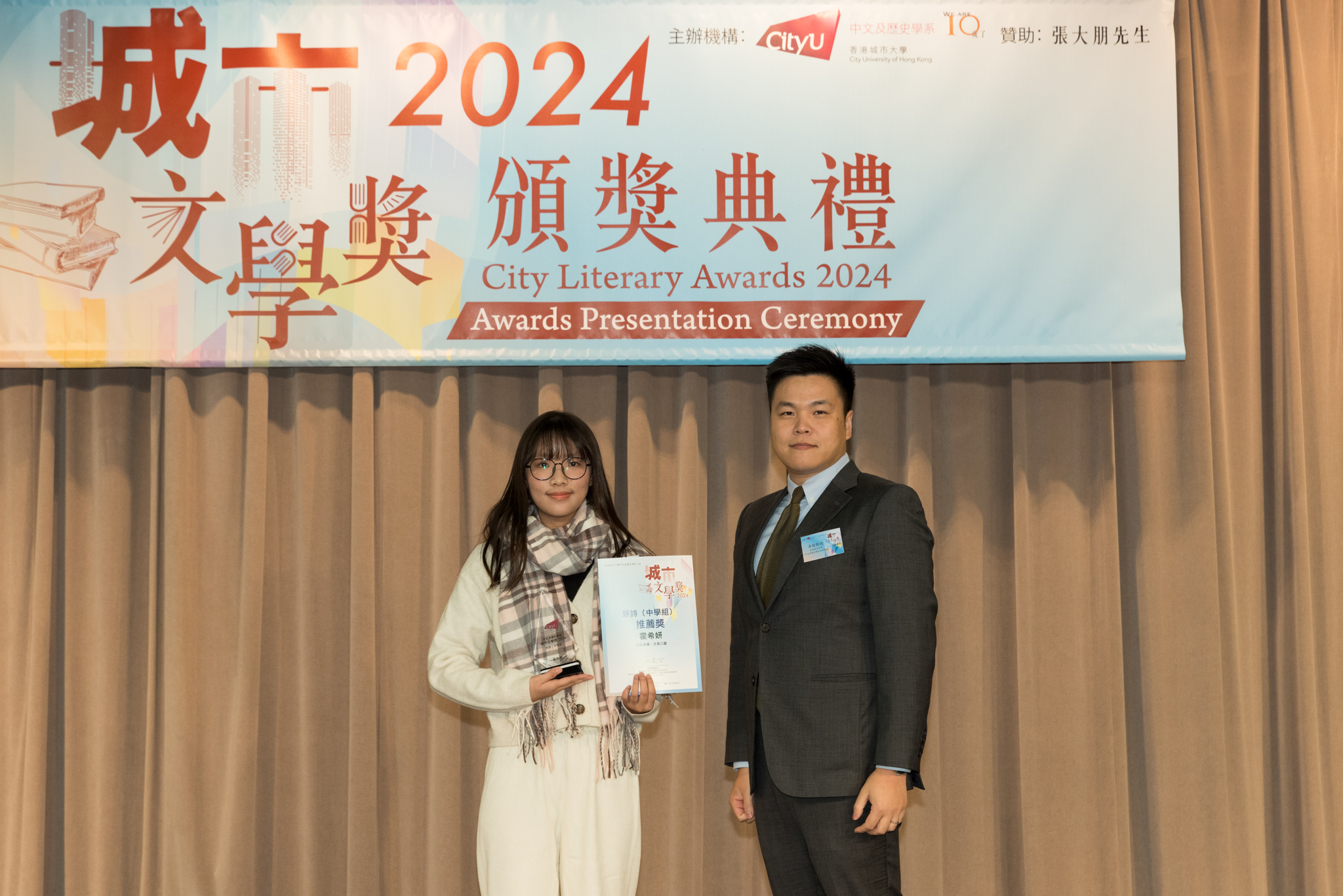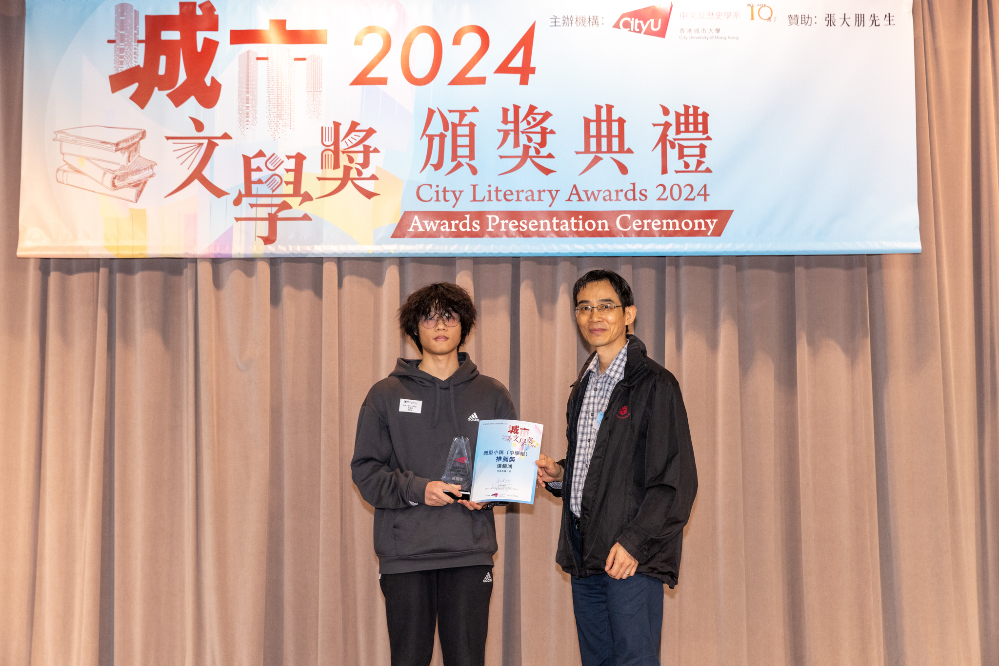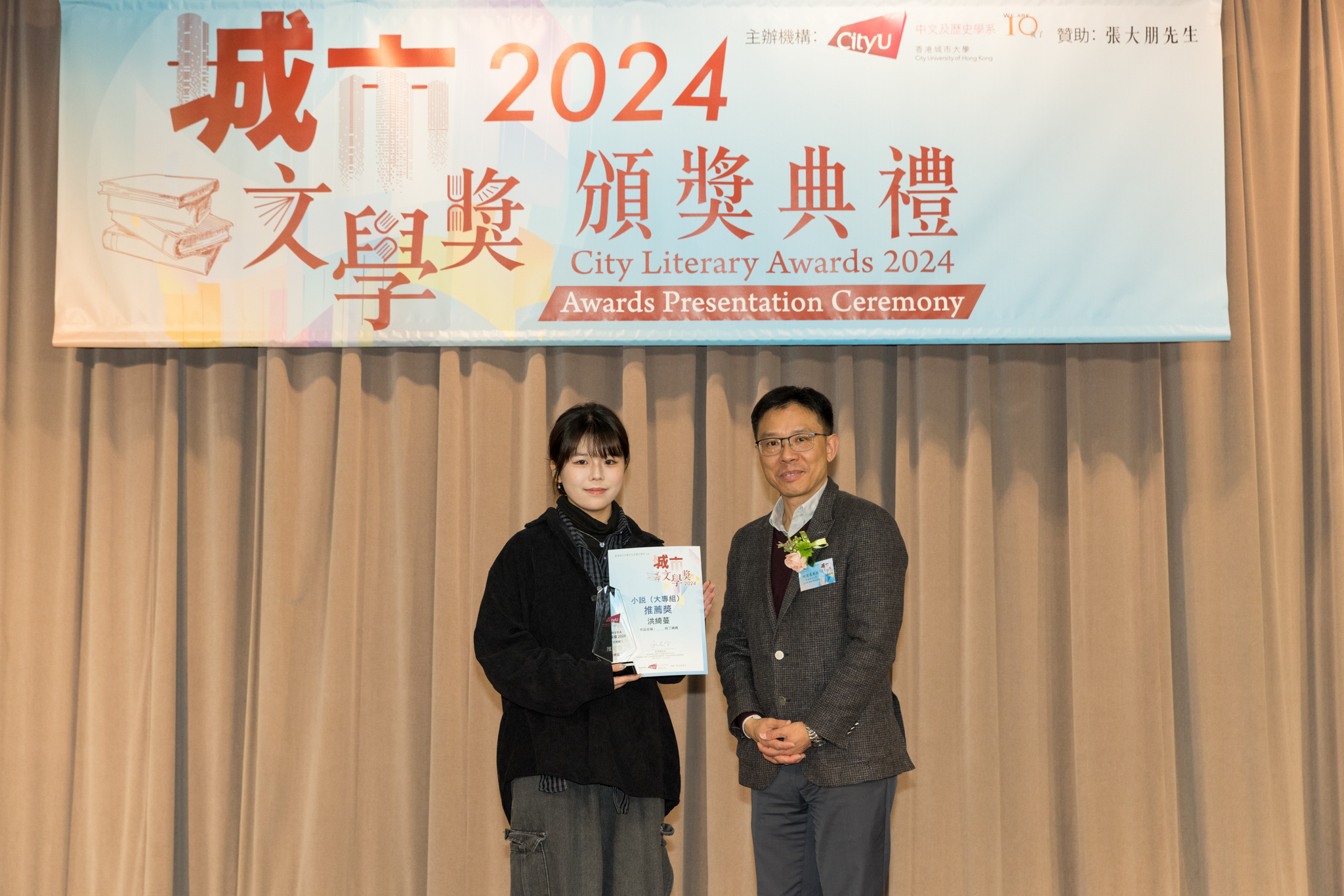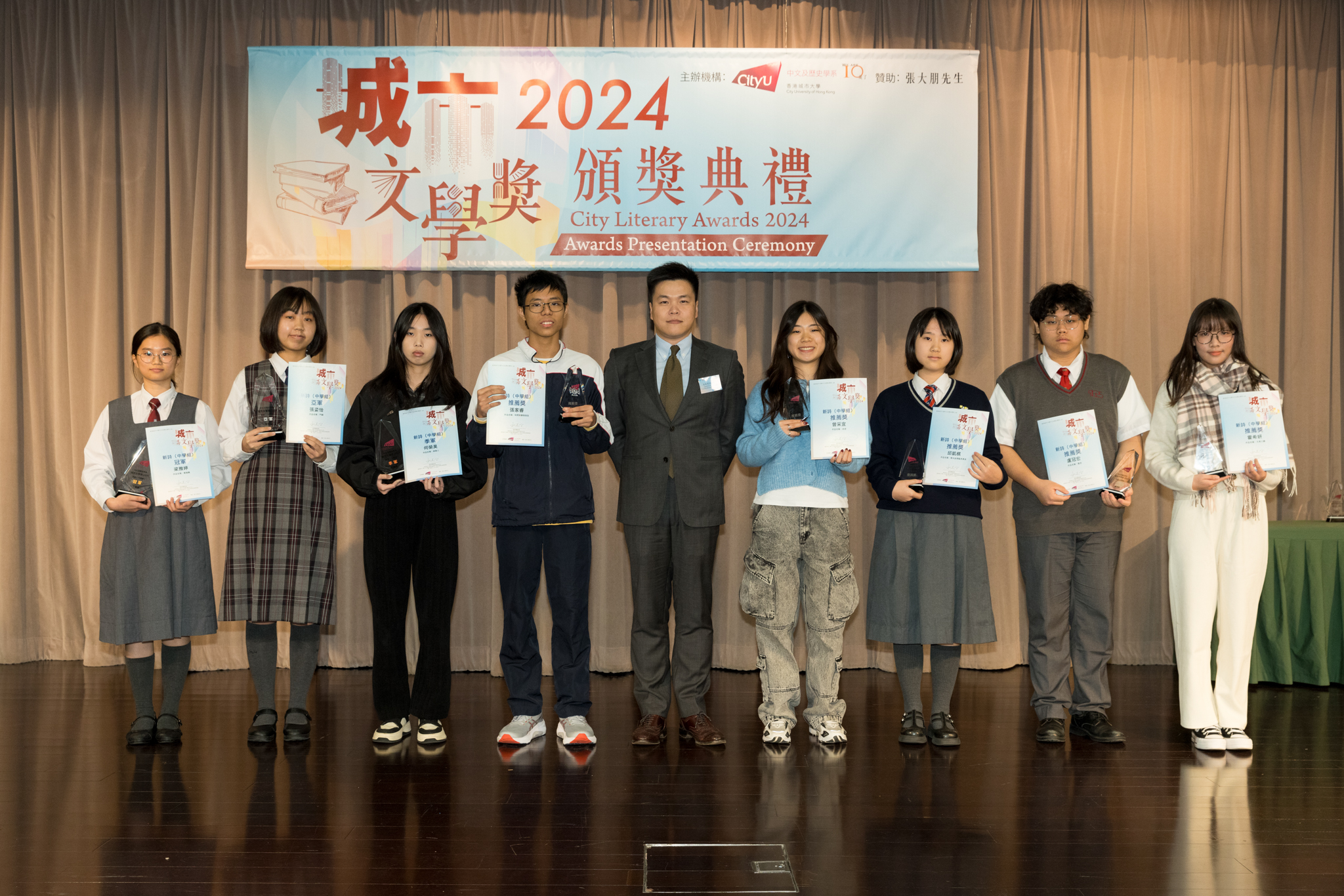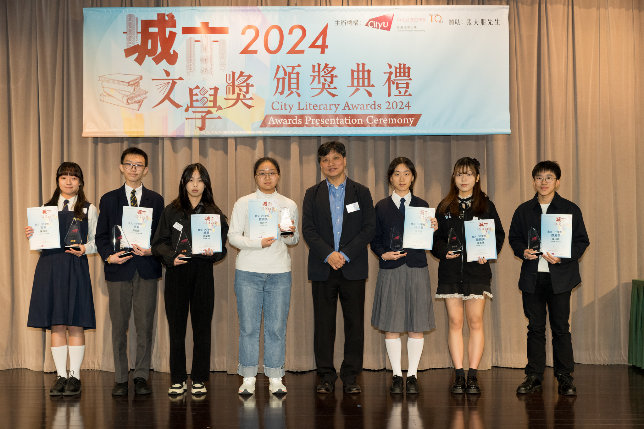 「城市文學獎2024」頒獎典禮已於12月14日圓滿舉行。我們衷心感謝香港城市大學協理學務副校長(學術事務)溫子堅講座教授、香港城市大學人文社會科學院院長何達基教授擔任主禮嘉賓。是次賽事共收到934篇參賽作品,大專組共計324篇;中學組方面,今屆有142所中學推薦學生參賽(每所學校於每類別獎項中最多只能推薦5篇優秀作品)。在頒獎典禮上,每個類別的冠軍分享了他們的寫作心得與獲獎感受,情感真摯、深刻動人。此外,出席典禮的各評審代表也抽出了寶貴時間即席分享各自的創作心得,為各青少年作家指點迷津,反響熱烈。我們期待「城市文學獎2026」再與大家見面,希望同學們的文學創作火苗生生不息,香港文學薪火相傳。