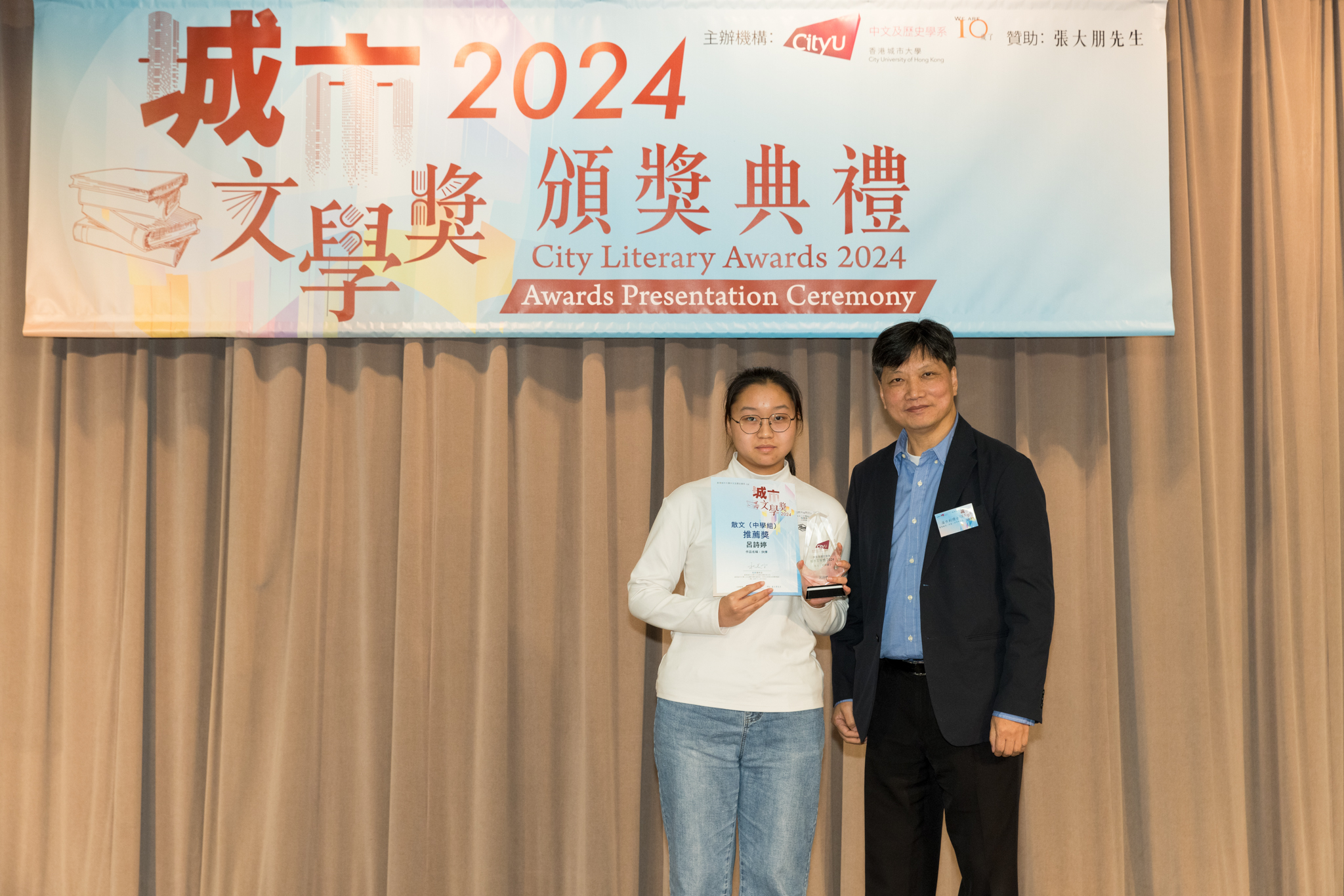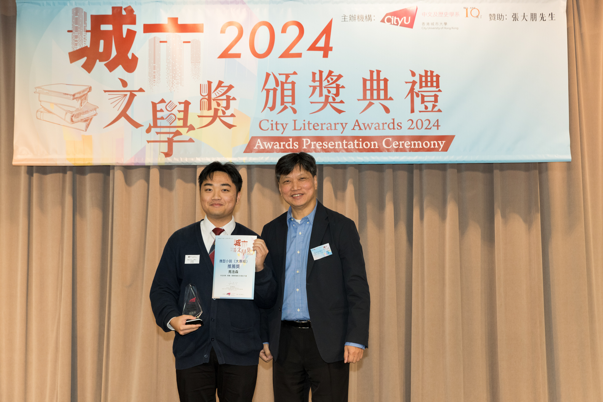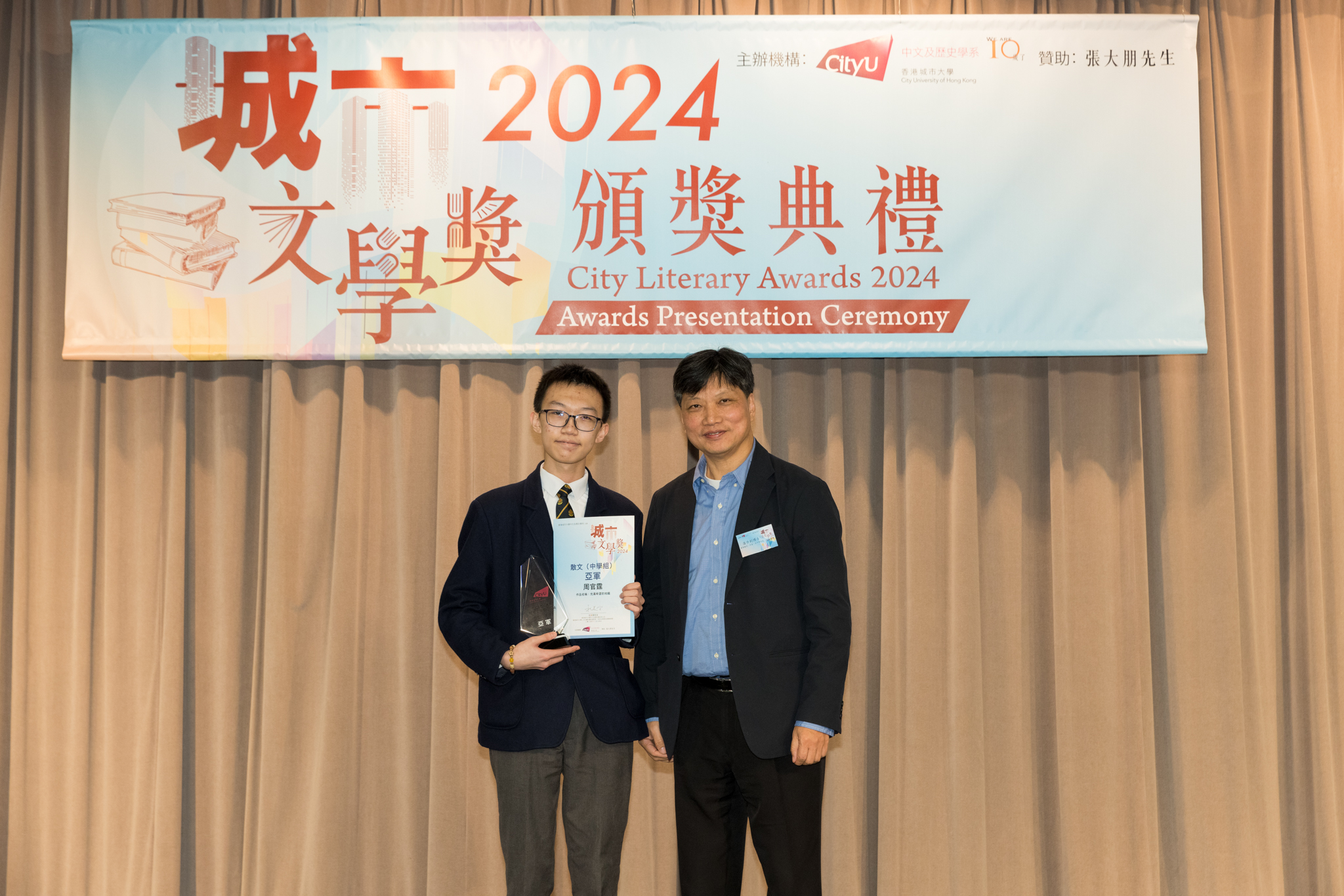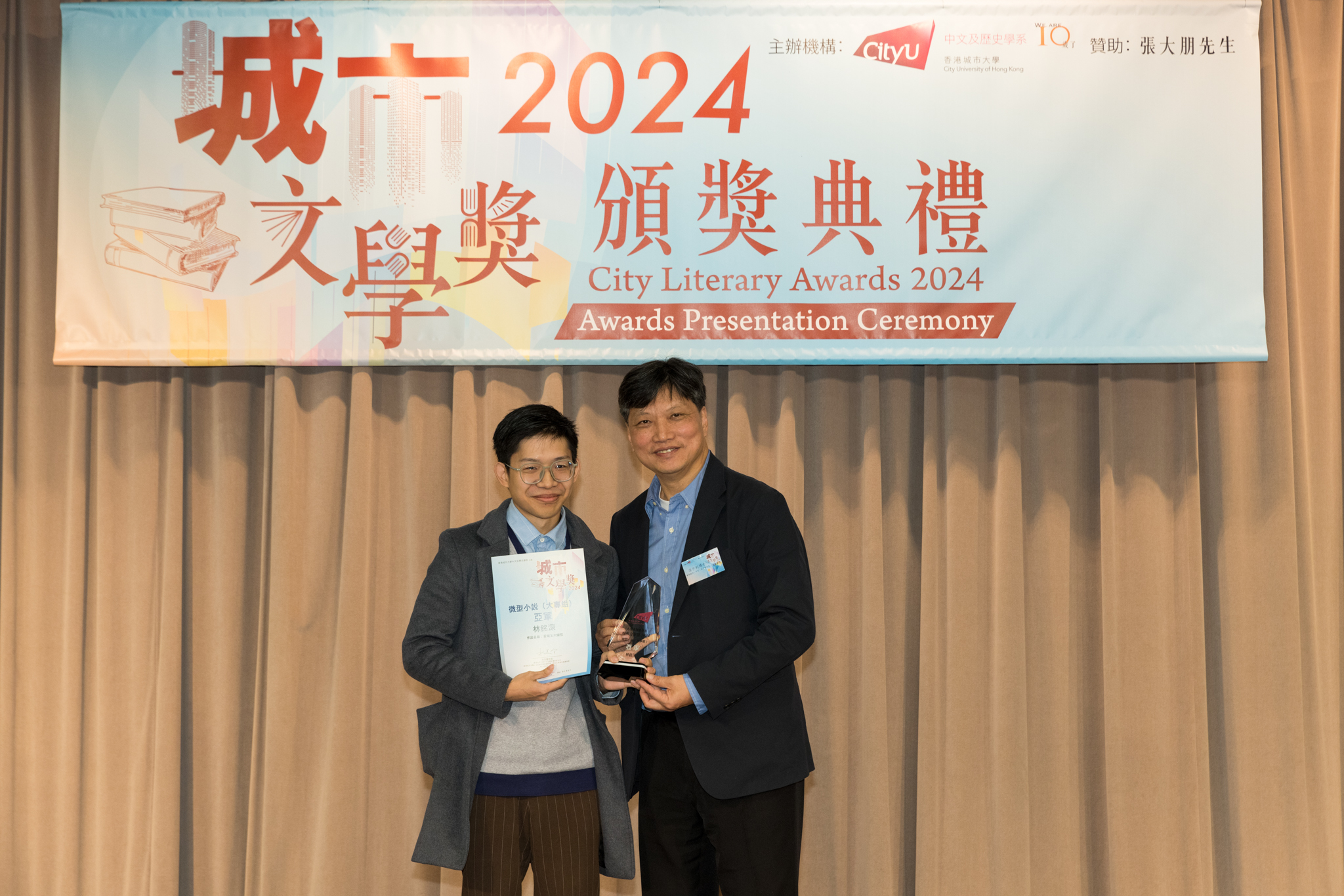 「城市文學獎2024」頒獎典禮已於12月14日圓滿舉行。我們衷心感謝香港城市大學協理學務副校長(學術事務)溫子堅講座教授、香港城市大學人文社會科學院院長何達基教授擔任主禮嘉賓。是次賽事共收到934篇參賽作品,大專組共計324篇;中學組方面,今屆有142所中學推薦學生參賽(每所學校於每類別獎項中最多只能推薦5篇優秀作品)。在頒獎典禮上,每個類別的冠軍分享了他們的寫作心得與獲獎感受,情感真摯、深刻動人。此外,出席典禮的各評審代表也抽出了寶貴時間即席分享各自的創作心得,為各青少年作家指點迷津,反響熱烈。我們期待「城市文學獎2026」再與大家見面,希望同學們的文學創作火苗生生不息,香港文學薪火相傳。