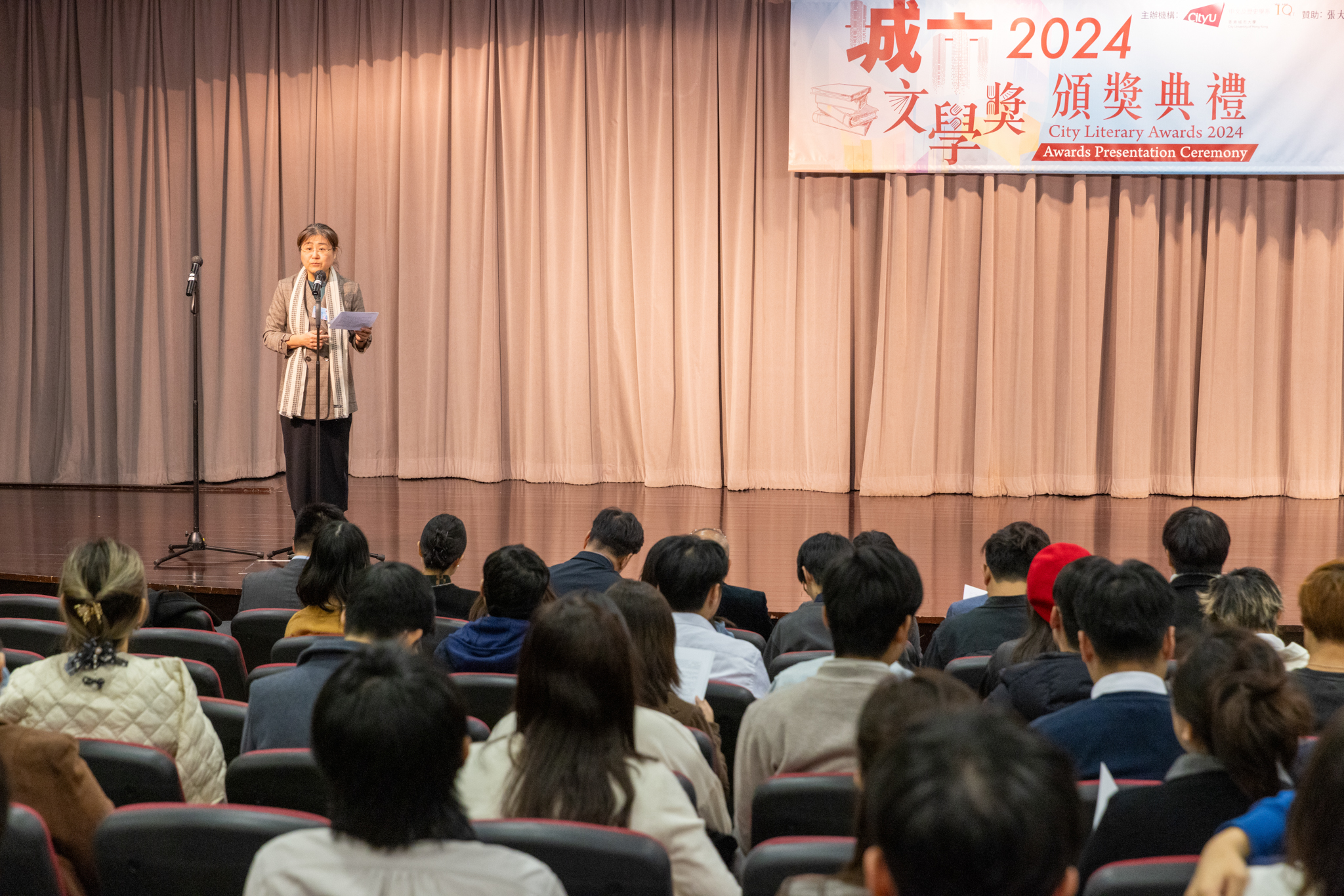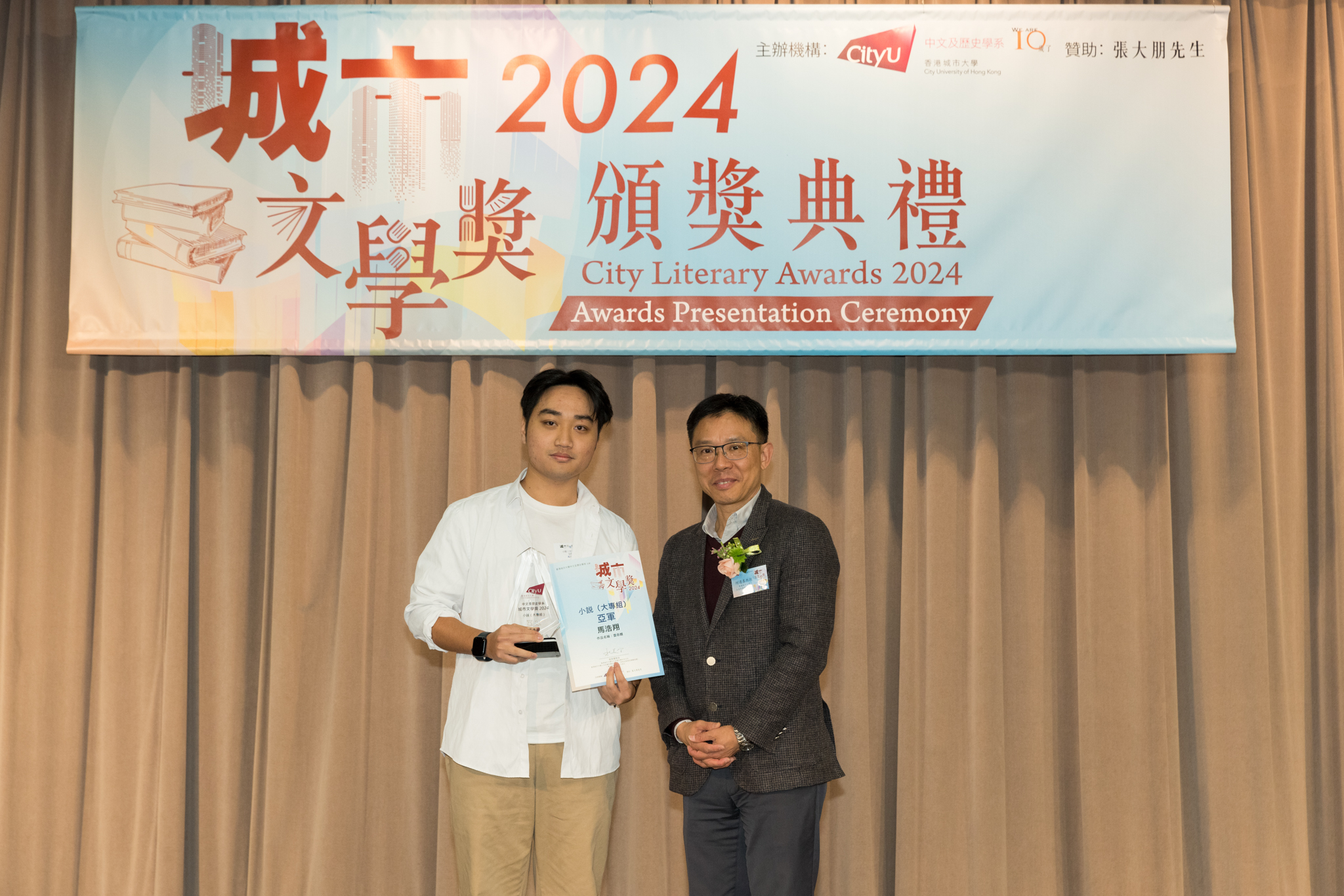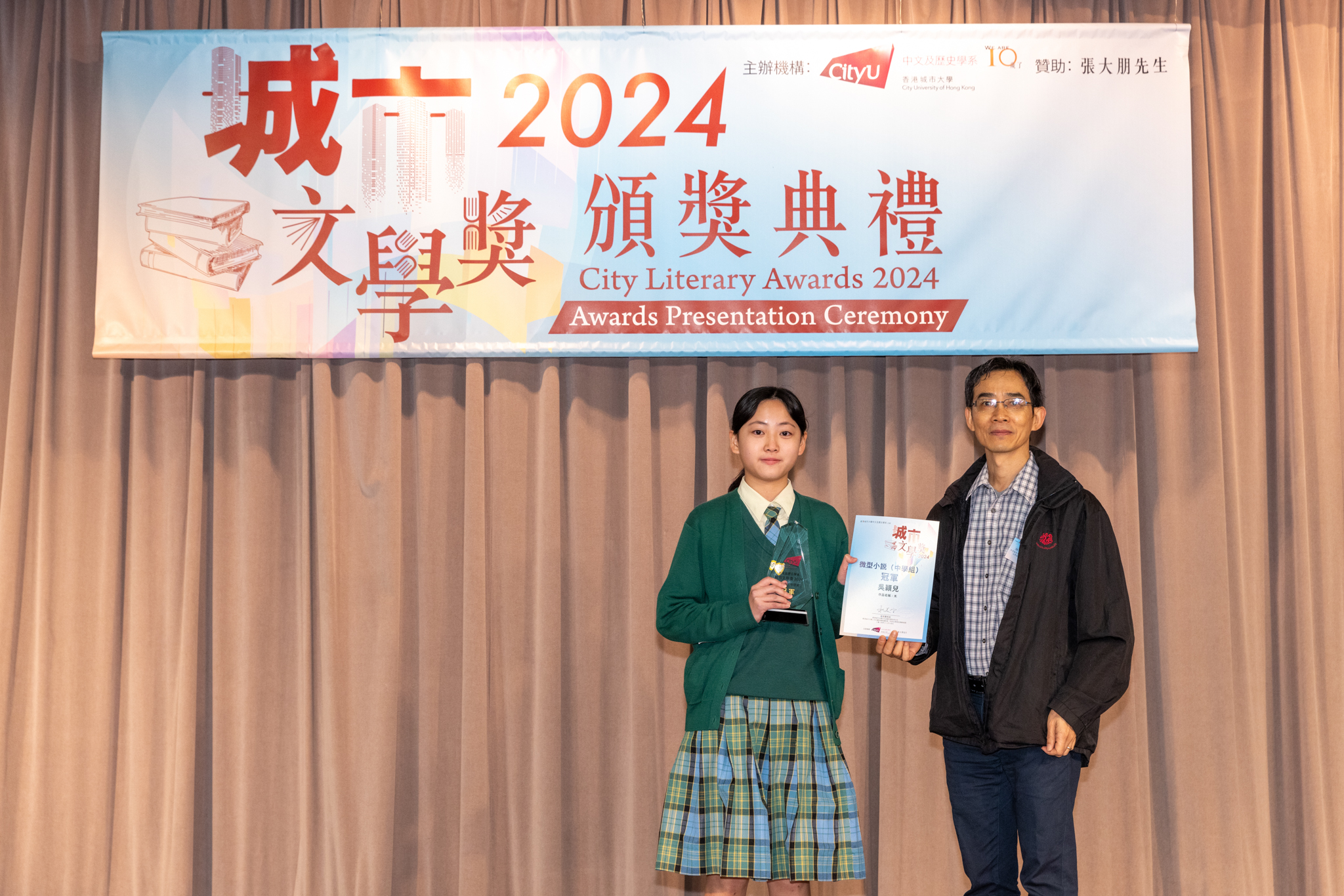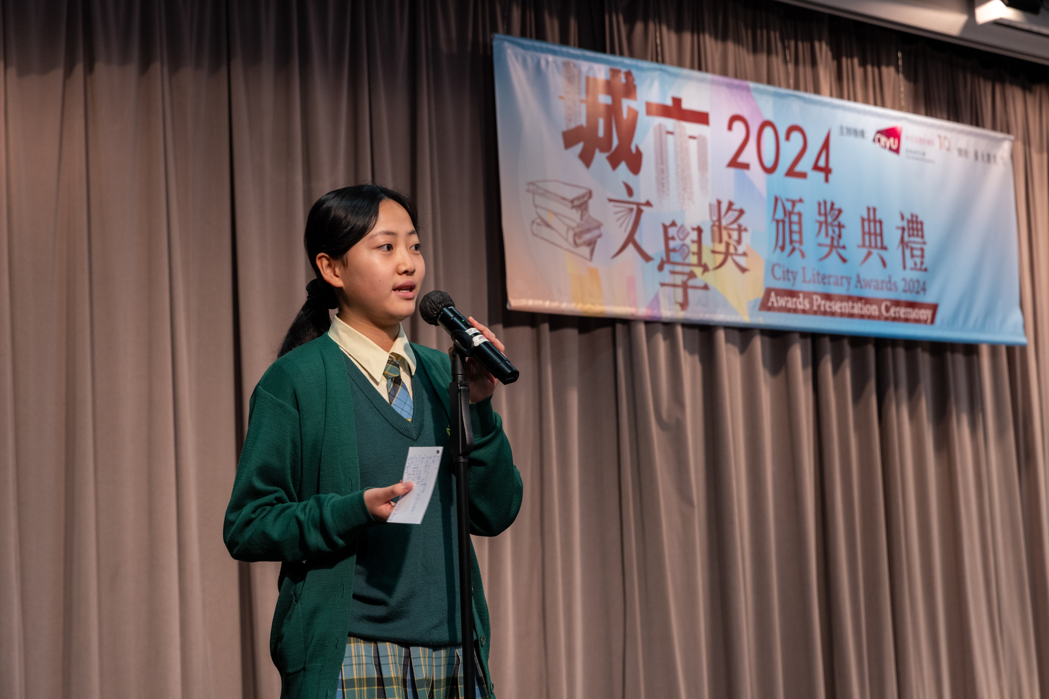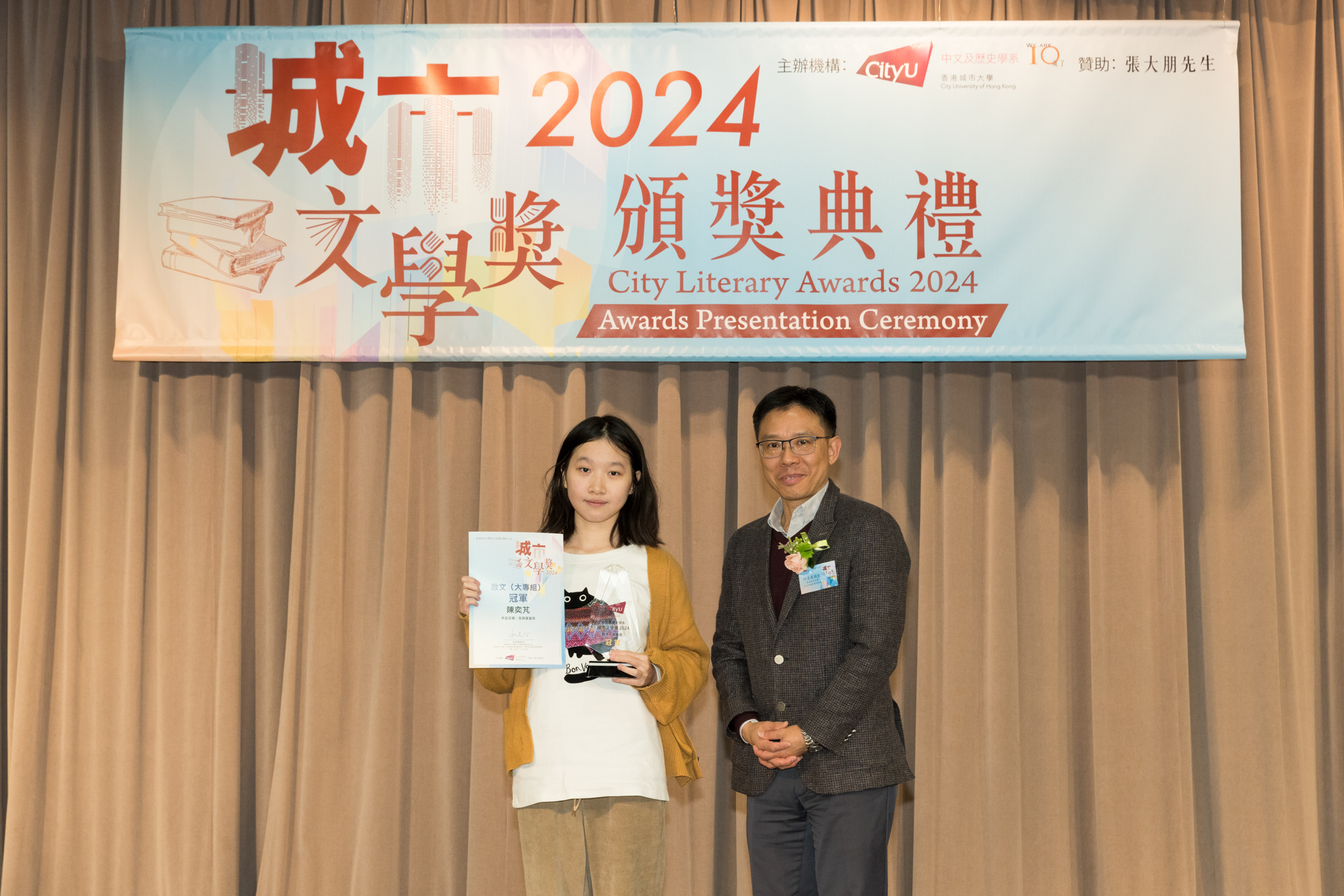 「城市文學獎2024」頒獎典禮已於12月14日圓滿舉行。我們衷心感謝香港城市大學協理學務副校長(學術事務)溫子堅講座教授、香港城市大學人文社會科學院院長何達基教授擔任主禮嘉賓。是次賽事共收到934篇參賽作品,大專組共計324篇;中學組方面,今屆有142所中學推薦學生參賽(每所學校於每類別獎項中最多只能推薦5篇優秀作品)。在頒獎典禮上,每個類別的冠軍分享了他們的寫作心得與獲獎感受,情感真摯、深刻動人。此外,出席典禮的各評審代表也抽出了寶貴時間即席分享各自的創作心得,為各青少年作家指點迷津,反響熱烈。我們期待「城市文學獎2026」再與大家見面,希望同學們的文學創作火苗生生不息,香港文學薪火相傳。