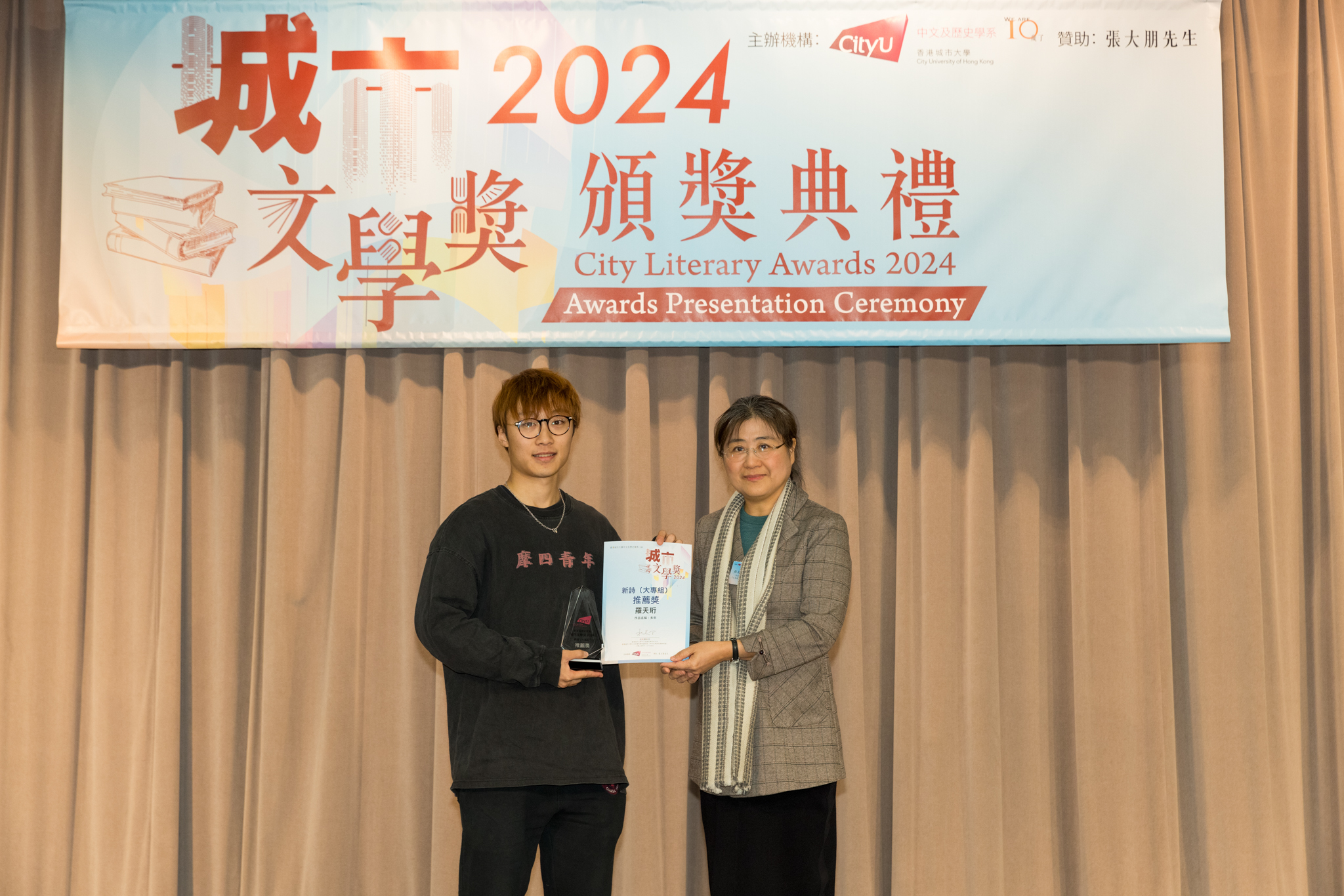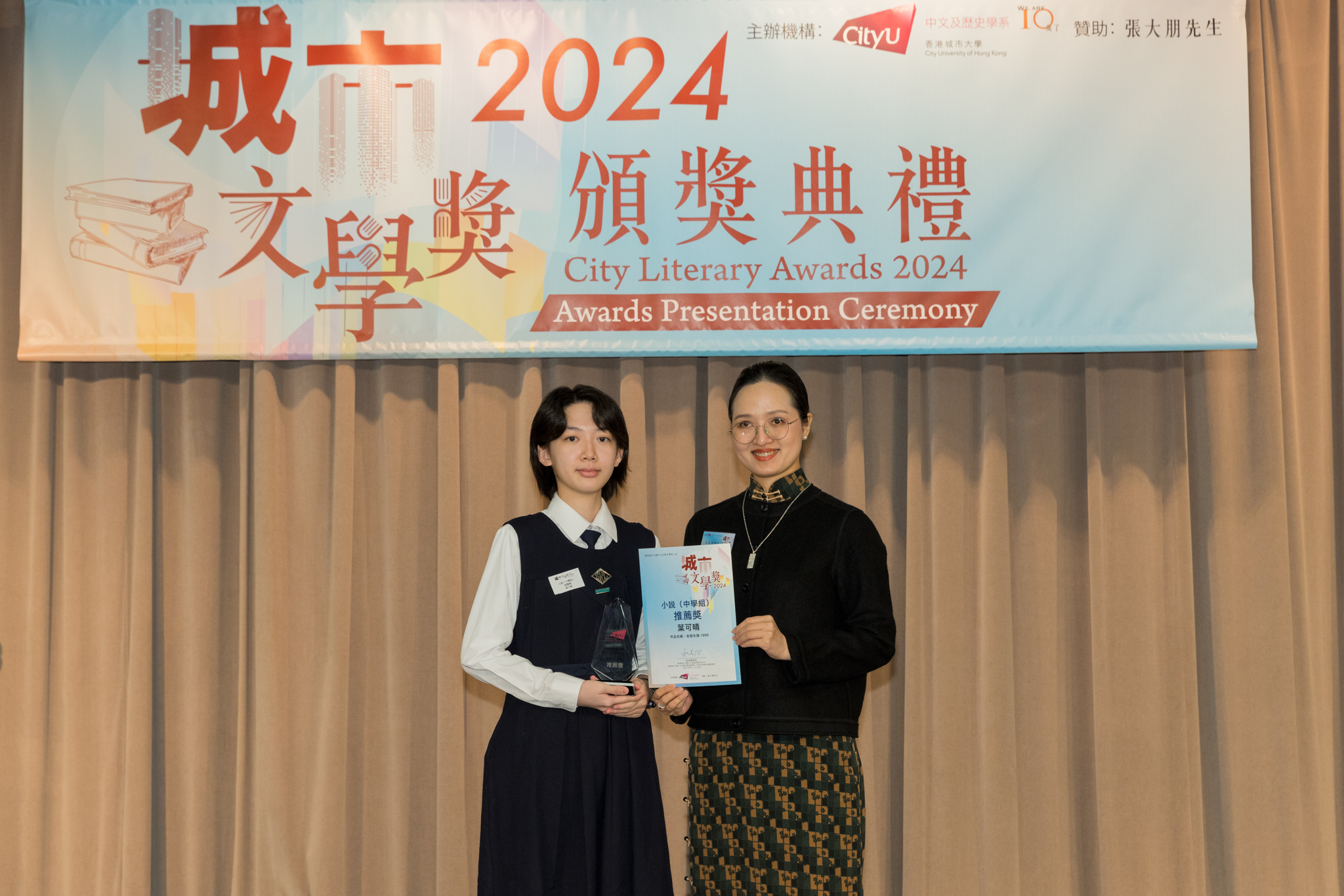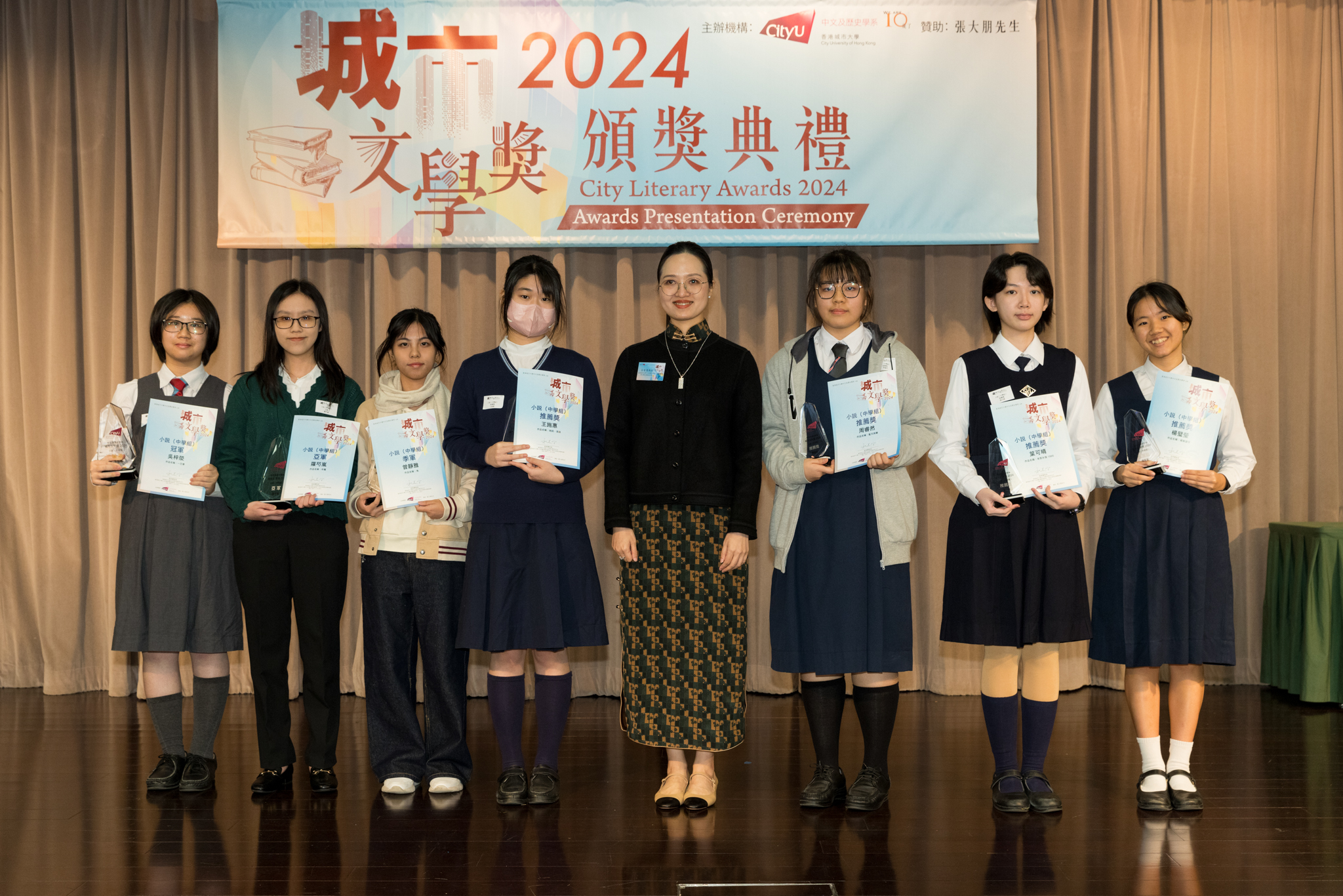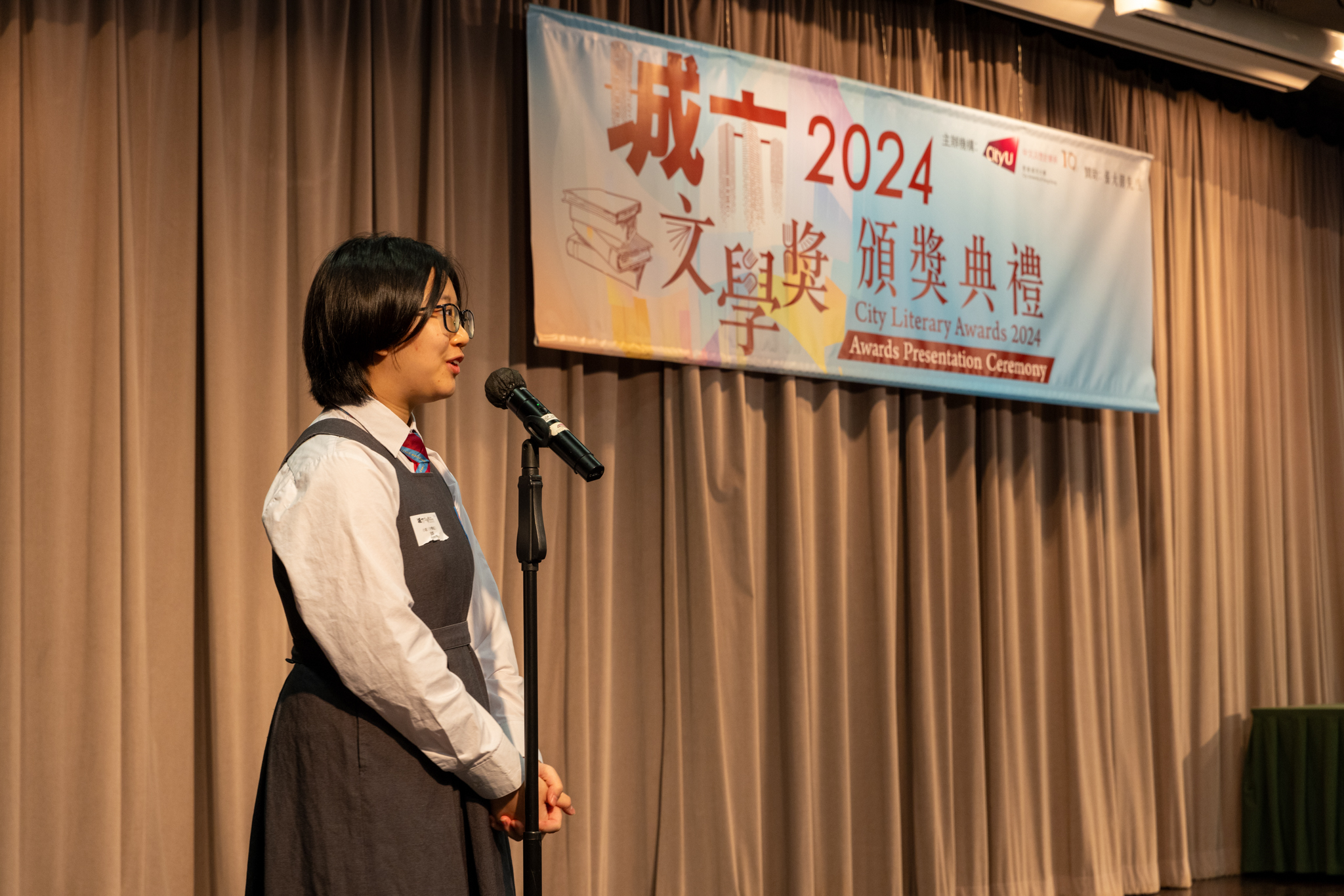 「城市文學獎2024」頒獎典禮已於12月14日圓滿舉行。我們衷心感謝香港城市大學協理學務副校長(學術事務)溫子堅講座教授、香港城市大學人文社會科學院院長何達基教授擔任主禮嘉賓。是次賽事共收到934篇參賽作品,大專組共計324篇;中學組方面,今屆有142所中學推薦學生參賽(每所學校於每類別獎項中最多只能推薦5篇優秀作品)。在頒獎典禮上,每個類別的冠軍分享了他們的寫作心得與獲獎感受,情感真摯、深刻動人。此外,出席典禮的各評審代表也抽出了寶貴時間即席分享各自的創作心得,為各青少年作家指點迷津,反響熱烈。我們期待「城市文學獎2026」再與大家見面,希望同學們的文學創作火苗生生不息,香港文學薪火相傳。