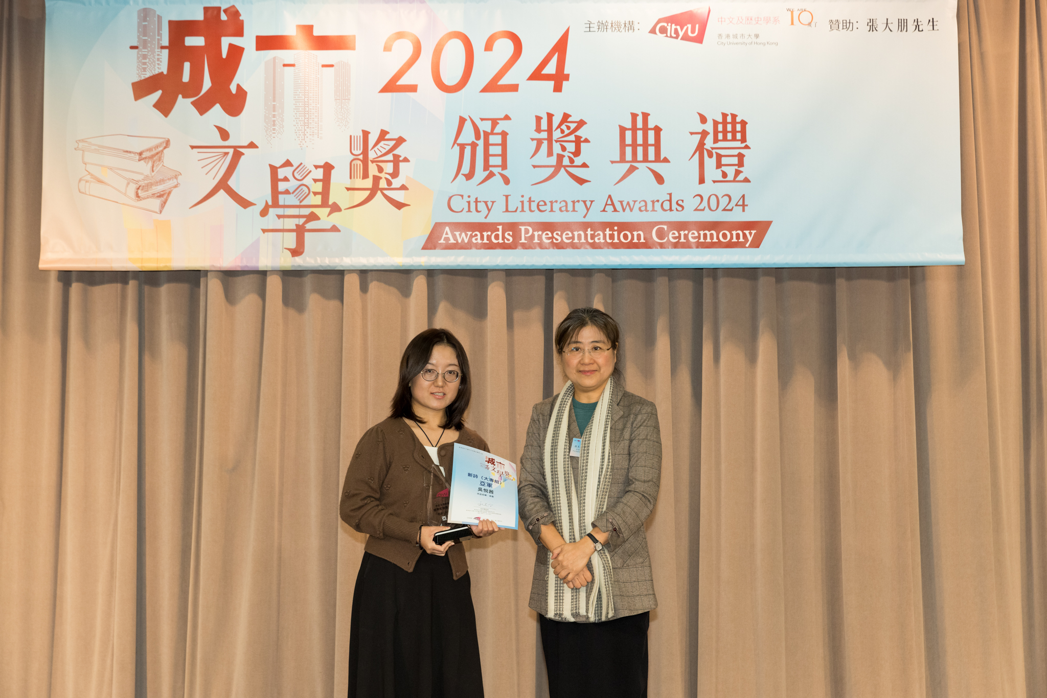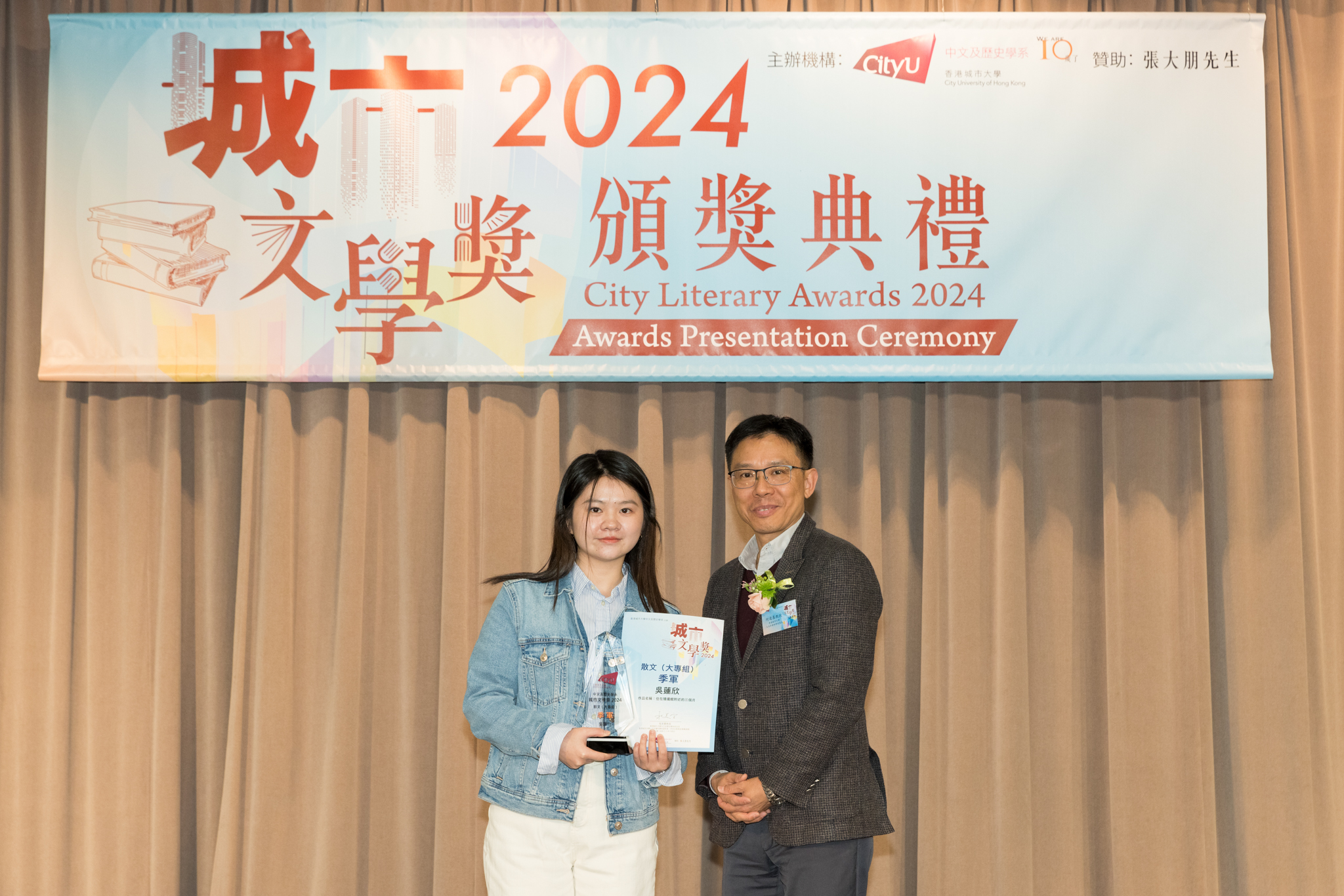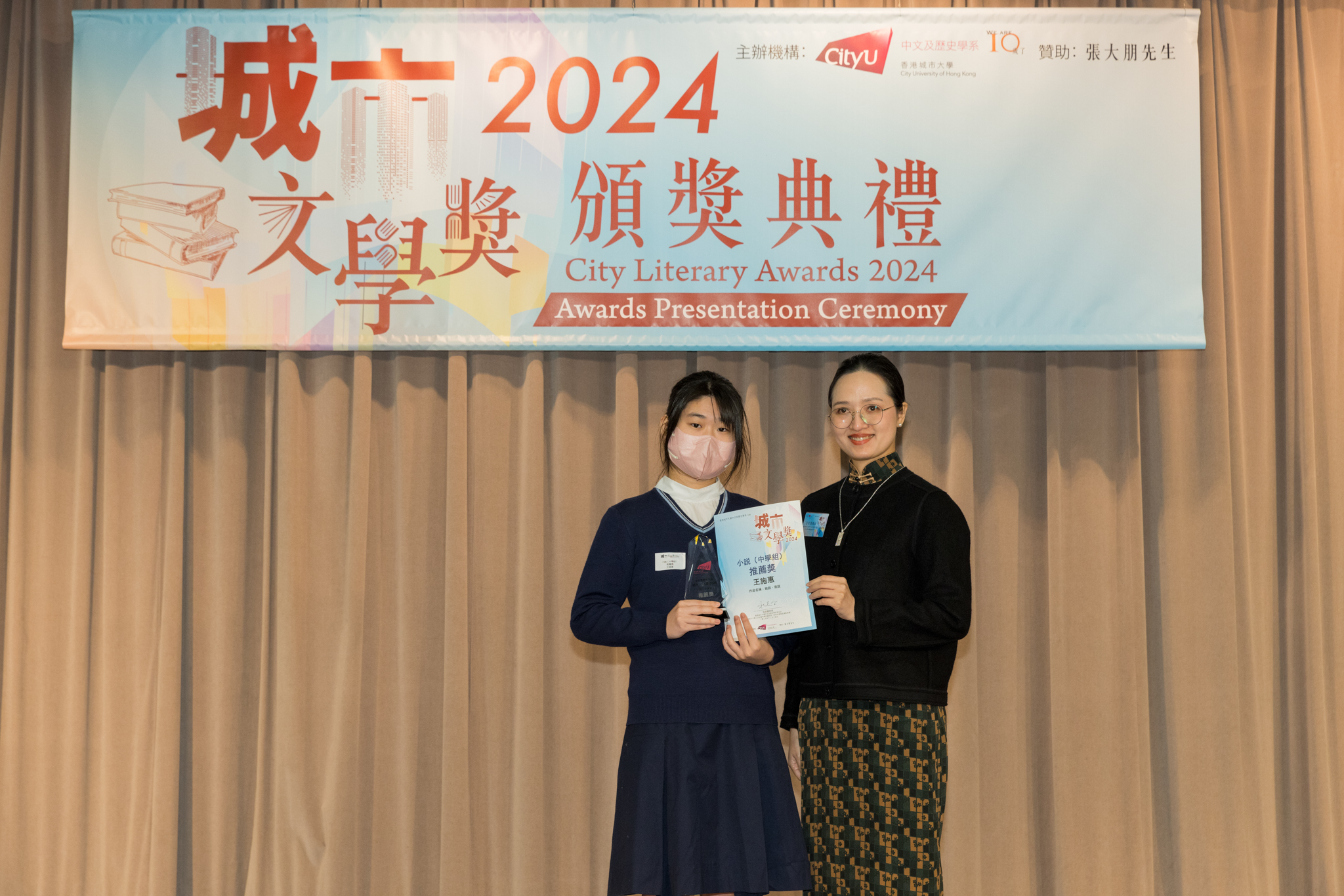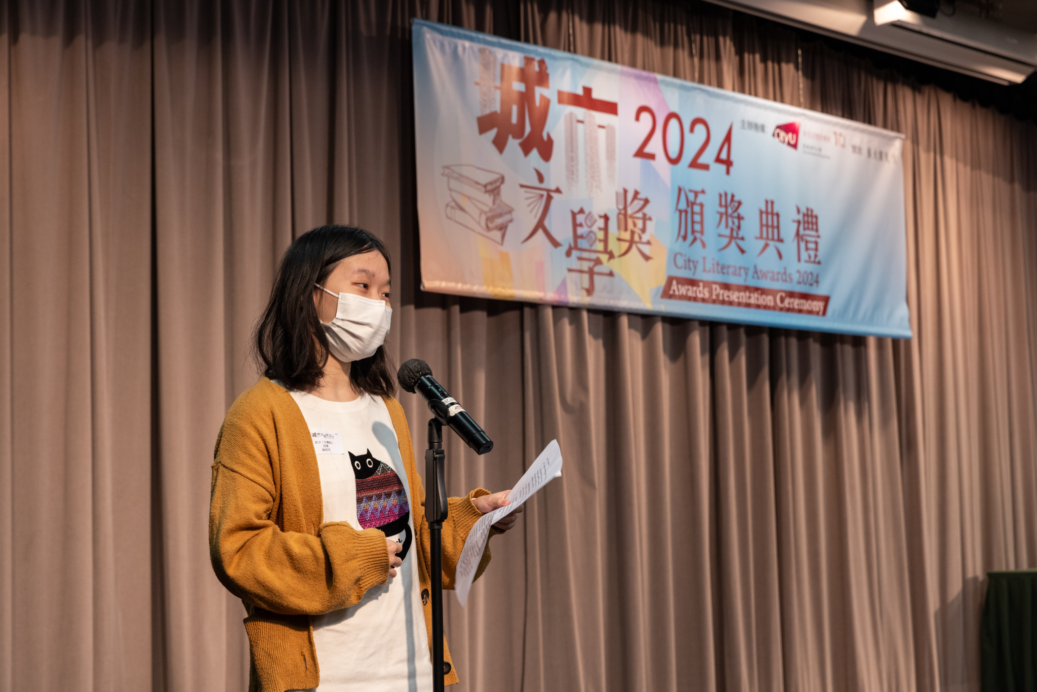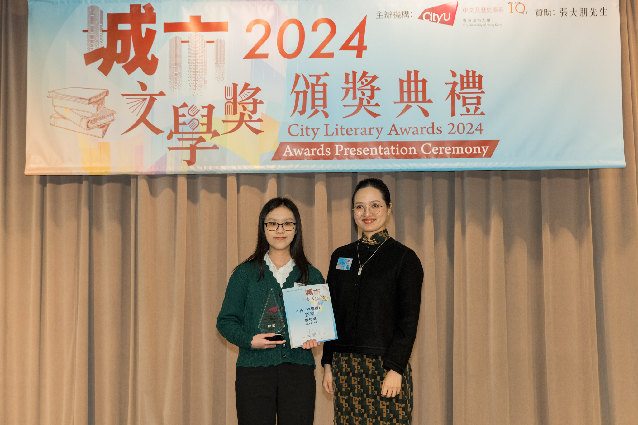 「城市文學獎2024」頒獎典禮已於12月14日圓滿舉行。我們衷心感謝香港城市大學協理學務副校長(學術事務)溫子堅講座教授、香港城市大學人文社會科學院院長何達基教授擔任主禮嘉賓。是次賽事共收到934篇參賽作品,大專組共計324篇;中學組方面,今屆有142所中學推薦學生參賽(每所學校於每類別獎項中最多只能推薦5篇優秀作品)。在頒獎典禮上,每個類別的冠軍分享了他們的寫作心得與獲獎感受,情感真摯、深刻動人。此外,出席典禮的各評審代表也抽出了寶貴時間即席分享各自的創作心得,為各青少年作家指點迷津,反響熱烈。我們期待「城市文學獎2026」再與大家見面,希望同學們的文學創作火苗生生不息,香港文學薪火相傳。