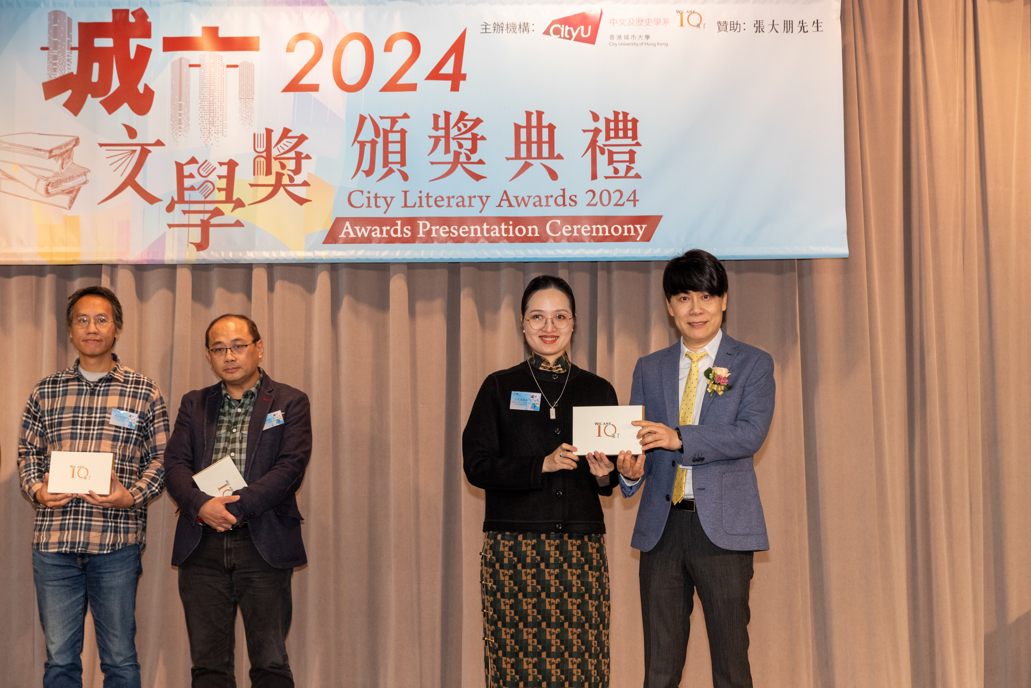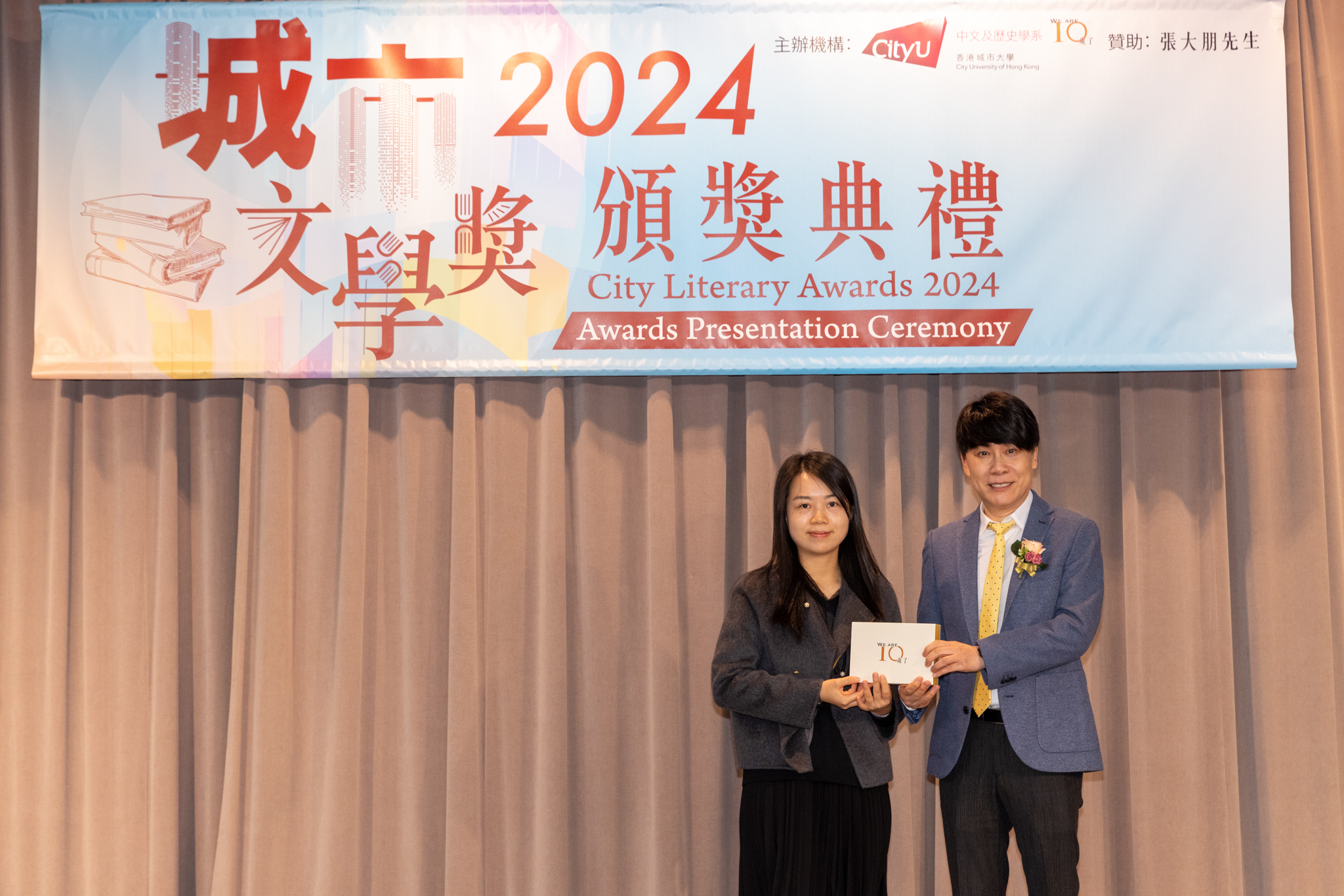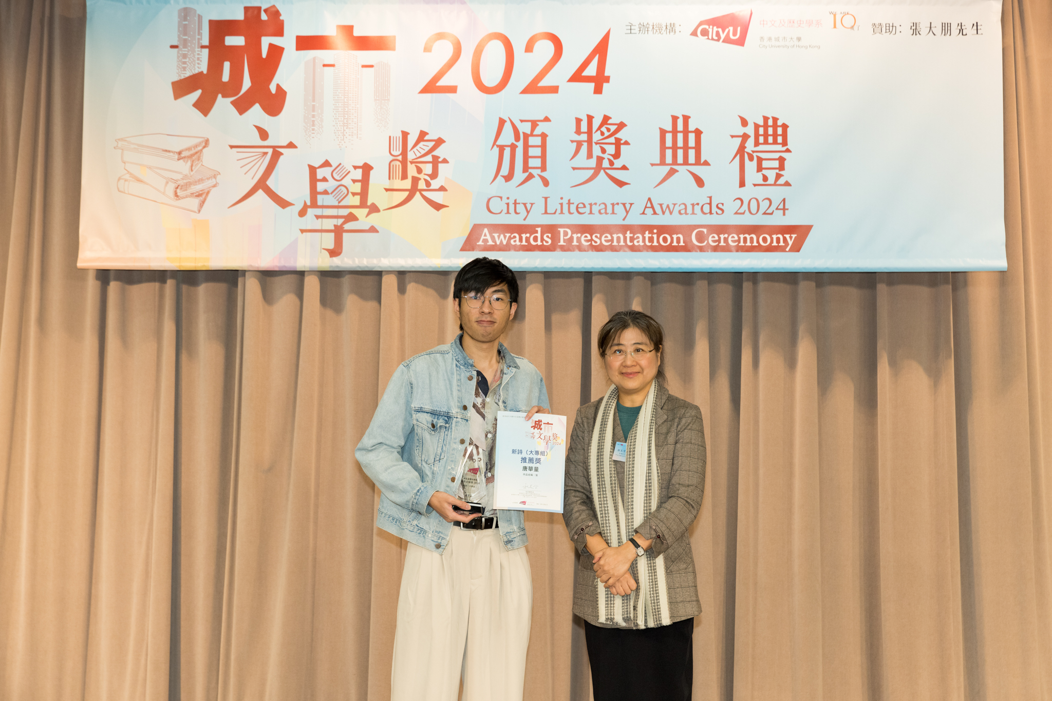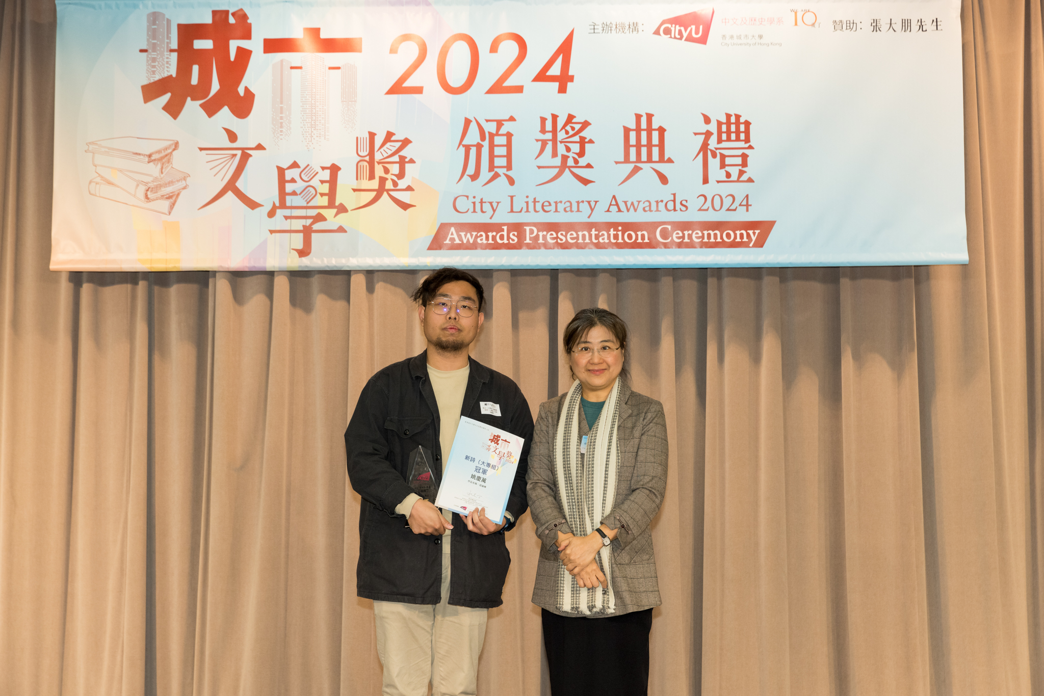 「城市文學獎2024」頒獎典禮已於12月14日圓滿舉行。我們衷心感謝香港城市大學協理學務副校長(學術事務)溫子堅講座教授、香港城市大學人文社會科學院院長何達基教授擔任主禮嘉賓。是次賽事共收到934篇參賽作品,大專組共計324篇;中學組方面,今屆有142所中學推薦學生參賽(每所學校於每類別獎項中最多只能推薦5篇優秀作品)。在頒獎典禮上,每個類別的冠軍分享了他們的寫作心得與獲獎感受,情感真摯、深刻動人。此外,出席典禮的各評審代表也抽出了寶貴時間即席分享各自的創作心得,為各青少年作家指點迷津,反響熱烈。我們期待「城市文學獎2026」再與大家見面,希望同學們的文學創作火苗生生不息,香港文學薪火相傳。