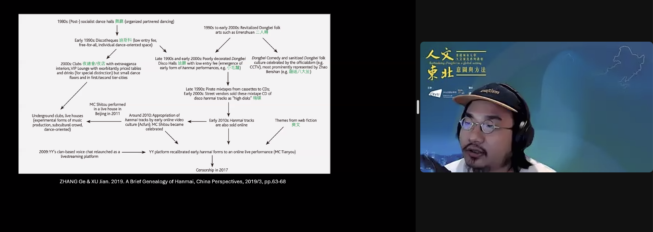 本演講的構想起源於講者與許建在2019年完成的一篇關於喊麥的研究,今年來的補充研究與田野調查進一步豐富了這一構想。「喊麥」作為一種聲音文化,一部分起源於東北的民俗文化,如二人轉(薩滿主義)、迪斯科、嗨碟,另外一部分則來自於網絡文化,如網絡文學,對嘻哈文化的解讀,同時包含了底層男性的自我想像。本講座希望通過以上這些聯結,勾勒出喊麥文化的東北脈絡。