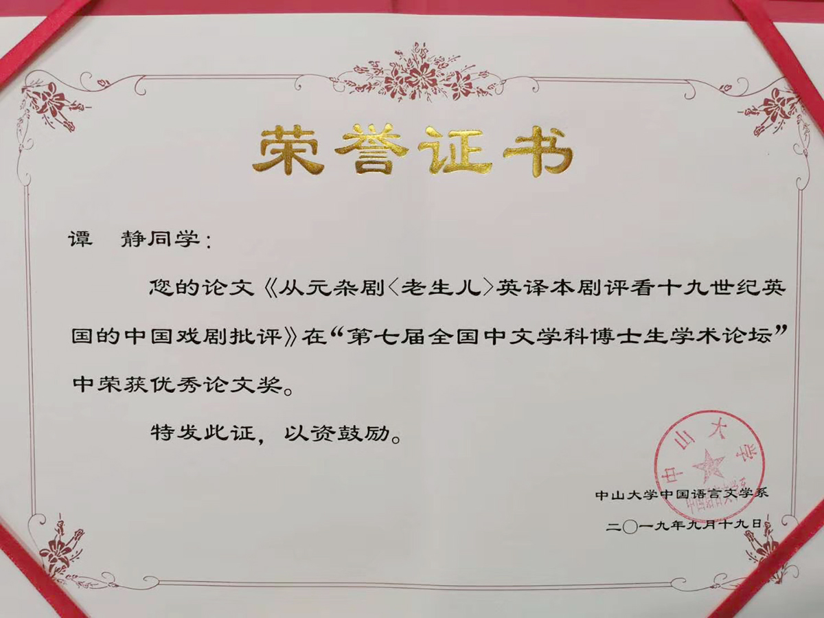 第七屆全國中文學科博士生學術論壇 中文及歷史學系博士生譚靜獲得此次論壇優秀論文獎 2019年9月18日到19日,第七屆全國中文學科博士生學術論壇在中山大學中文系召開。博士生譚靜通過遴選參加了此次論壇並宣讀論文。她的論文《從元雜劇〈老生兒〉英譯本劇評看十九世紀英國的中國戲劇批評》獲得此次論壇優秀論文獎。 ,