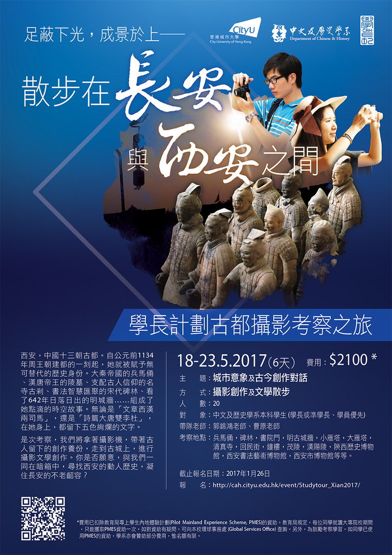 西安,中國十三朝古都。自公元前1134年周王朝建都的一刻起,她就被賦予無可替代的歷史身份。大秦帝國的兵馬俑、漢唐帝王的陵墓、支配古人信仰的名寺古剎、書法智慧匯聚的宋代碑林、看了642年日落日出的明城牆……組成了她點滴的時空故事。無論是「文章西漢兩司馬」,還是「詩篇大唐雙李杜」,在她身上,都留下五色絢爛的文字。 是次考察,我們將拿著攝影機,帶著古人留下的創作養份,走到古城上,進行攝影文學創作。你是否願意,與我們一同在暗箱中,尋找西安的動人歷史,凝住長安的不老齠容?